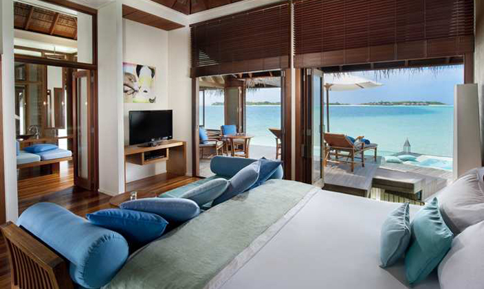 提供日光浴與無限池,沉沒浴缸,浮床。這個別墅是建立在高蹺上的水和室外陽臺與大無邊泳池。日光浴甲板上還具有木制太陽傘和躺椅,咖啡桌。甲板上有一個凹陷的泳池,和一個50寸的等離子電視??照{(diào)別墅還帶有一個冷藏迷你酒吧,iPod連接器和一系列的沐浴產(chǎn)品CD音響。
